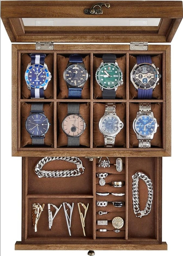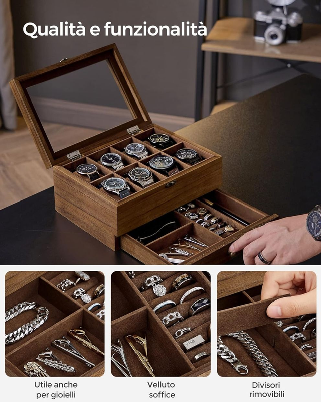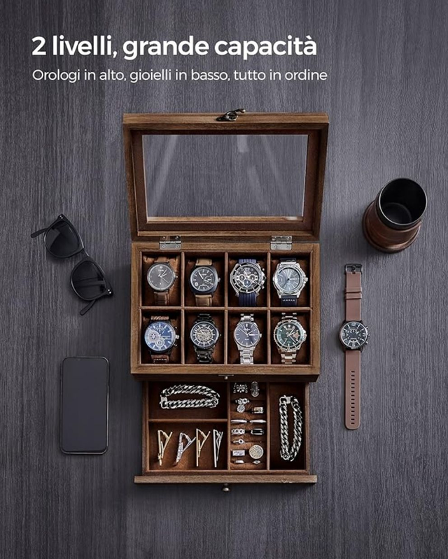 Scatola porta orologi in legno da 8 posti con cassetto, 2 in 1: